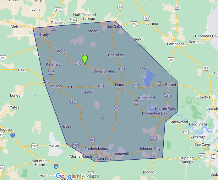 Brady, San Saba, Cherokee, Llano, Marble Falls, Kingsland, Horseshoe Bay, Burnet, Mason, Fredericksburg, Johnson City, Stonewall (and anywhere in between!).