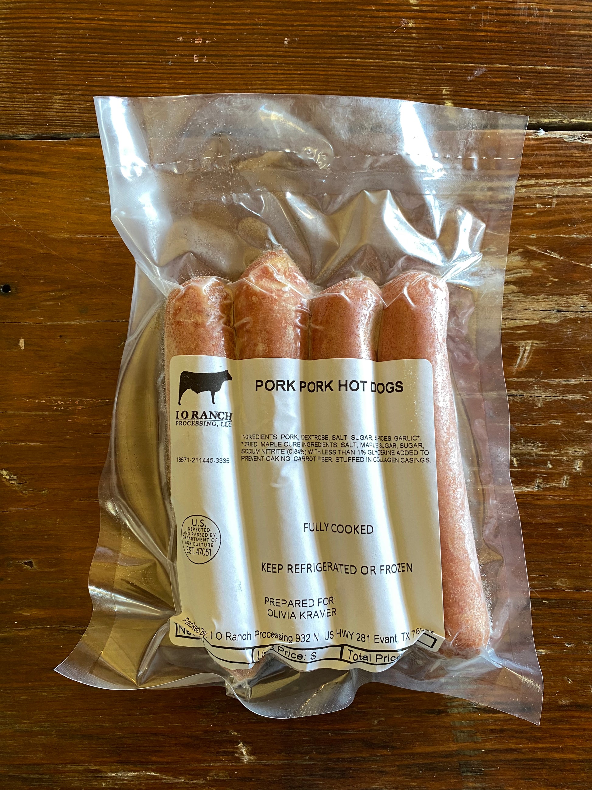 4 hot dogs/pack, ~ 0.6 lbs/pack